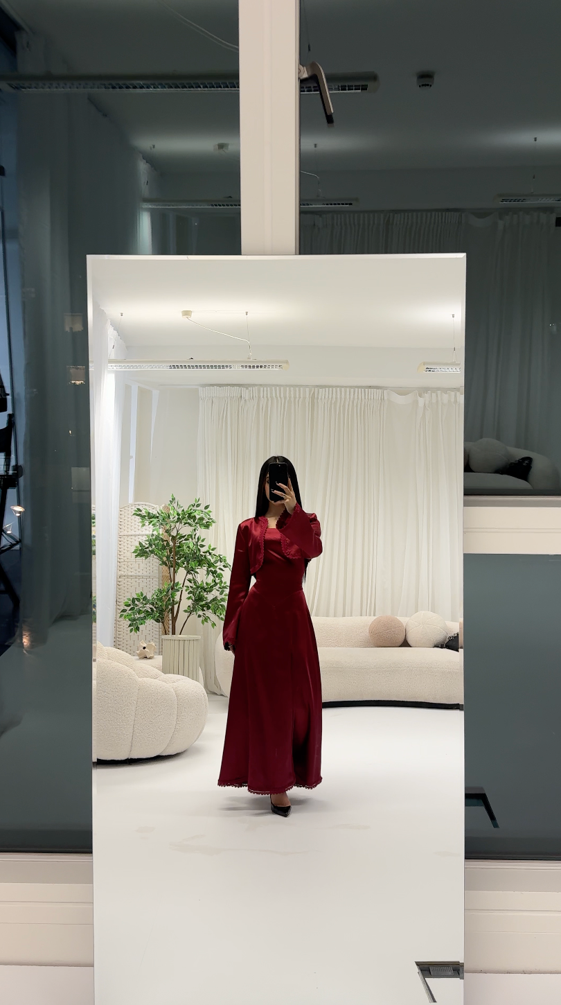 A statement in burgundy satin, the ROJIN ensemble pairs a cropped bolero jacket with a flowing maxi dress. Delicate lace trims the edges and bell sleeves, while the square neckline and empire waist create a flattering silhouette. The rich fabric drapes beautifully, catching light with every movement.